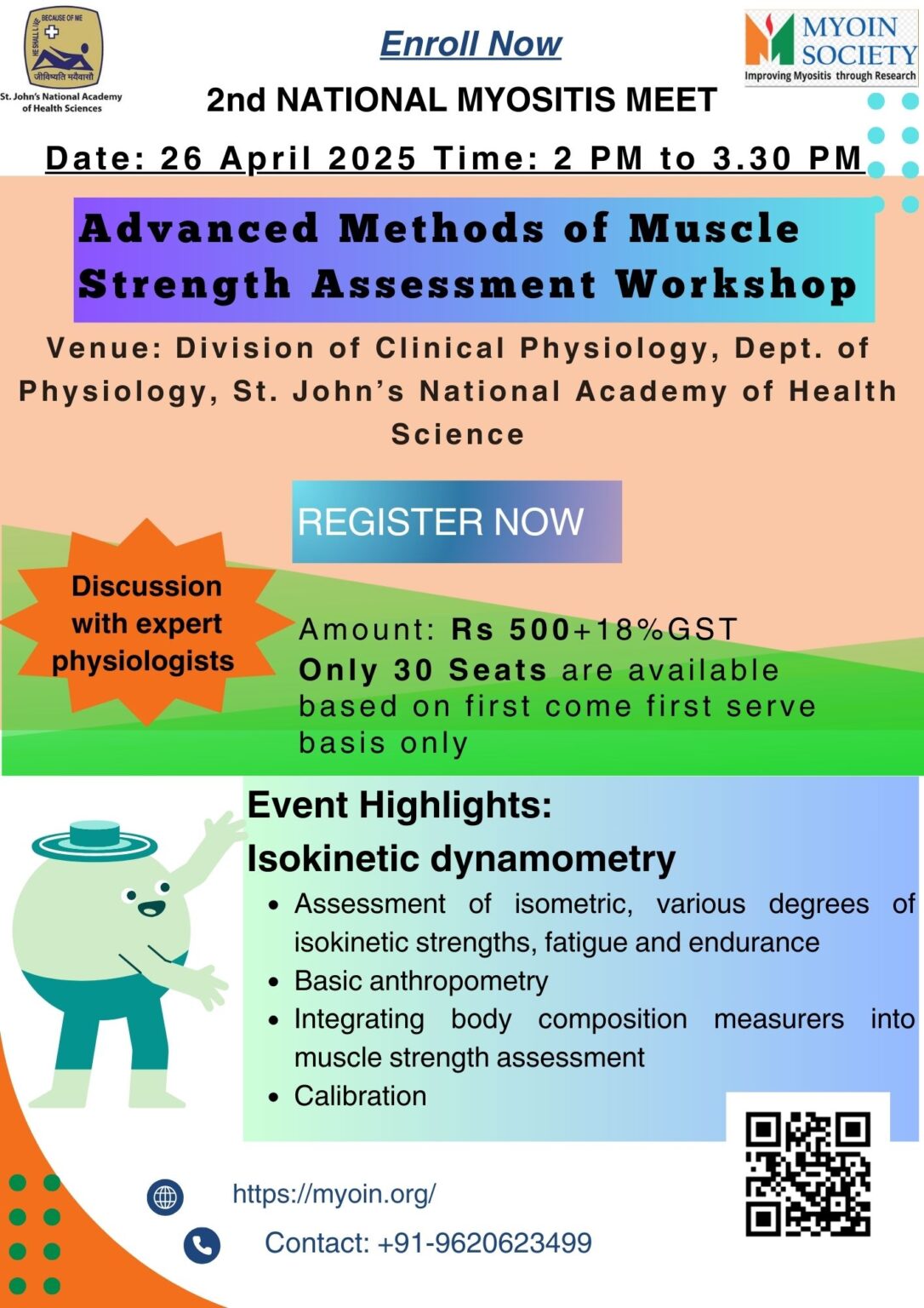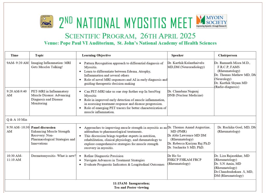 The Second National Myositis Meet is scheduled for Saturday, April 26, 2025, at the St. John’s National Academy of Health Science, Bengaluru.